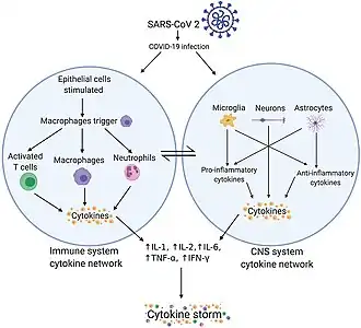 Available evidence indicates that SARS-CoV2 enters the central nervous system through the lymphatic system and the virus was confirmed present in the capillaries and neuronal cells of the frontal lobe of COVID-19 patients.[31] This is corroborated with evidence demonstrating that SARS-CoV2 was present in cerebral spinal fluid of infected patients which displayed severe neurological symptoms. Viral infection is capable of inducing neuroinflammation through neuro-immune interactions. While aging is the most significant risk factor in the development of neurodegenerative diseases like Alzheimers, Parkinson's, and Amyotrophic lateral sclerosis, chronic, low-grade inflammation and immunosenescence may be aggravated by a viral infection, worsening the aging phenotype and contributing to the development of neurodegenerative disease. For example, neuroinflammation has been shown to contribute greatly to the severity and pathogenesis of Parkinson's disease. Infection by the H1N1 virus was shown to contribute to Parkinson's disease development.[31]