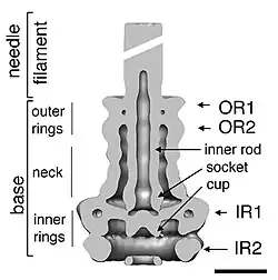 As with almost all proteins, the visualization of T3SS NCs is only possible with electron microscopy. The first images of NCs (1998) showed needle structures protruding from the cell wall of live bacteria and flat, two-dimensional isolated NCs.[29] In 2001 images of NCs from Shigella flexneri were digitally analyzed and averaged to obtain a first semi-3D structure of the NC.[8] The helical structure of NCs from Shigella flexneri was resolved at a resolution of 16 Å using X-ray fiber diffraction in 2003,[30] and a year later a 17-Å 3D structure of NCs from Salmonella typhimurium was published.[31] Recent advances and approaches have allowed high-resolution 3D images of the NC,[32][33] further clarifying the complex structure of the NC.