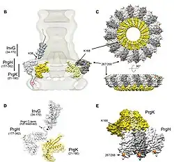 - ↑ Schraidt O, Lefebre MD, Brunner MJ, Schmied WH, Schmidt A, Radics J, et al. (April 2010). Stebbins CE (ed.). "Topology and organization of the Salmonella typhimurium type III secretion needle complex components". PLOS Pathogens. 6 (4): e1000824. doi:10.1371/journal.ppat.1000824. PMC 2848554. PMID 20368966.