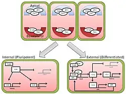 Together these transcription factors function in a positive feedback loop that strengthens the ICM to TE cellular allocation. Initial polarization of blastomeres occurs at the 8-16 cell stage. An apical-basolateral polarity is visible through the visualization of apical markers such as Par3, Par6, and aPKC as well as the basal marker E-Cadherin.[3] The establishment of such a polarity during compaction is thought to generate an environmental identity for inside and outside cells of the embryo. Consequently, stochastic expression of the above transcription factors is amplified into a feedback loop that specifies outside cells to a TE fate and inside cells to an ICM fate. In the model, an apical environment turns on Cdx2, which upregulates its own expression through a downstream transcription factor, Elf5. In concert with a third transcription factor, Eomes, these genes act to suppress pluripotency genes like Oct4 and Nanog in the outside cells.[3][9] Thus, TE becomes specified and differentiates. Inside cells, however, do not turn on the Cdx2 gene, and express high levels of Oct4, Nanog, and Sox2.[3][4] These genes suppress Cdx2 and the inside cells maintain pluripotency generate the ICM and eventually the rest of the embryo proper.