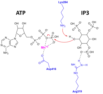 Evidence for this exquisite specificity and for the catalytic mechanism was found when the apo-enzyme, substrate-bound complex, and product-bound complex X-ray crystal structures of ITPKA were determined.[10][11] The figure to the right depicts the catalytic mechanism, whereby the 3'OH of IP3 attacks the gamma-phosphate of ATP, and amino acid residues of ITPK important for stabilizing the substrates and products in the active site.