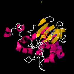 In further detail, the larger domain of the protein structure has an α/β-class structure. The domain has an N-terminal and a C-terminal lobe with a cleft in between and each of these lobes is built around an antiparallel β-sheet. In the N-terminal, the sheet has three strands, whereas in the C-terminal there is a five-stranded sheet. The second domain, is α-helical and consists of four α helices linked by long loops. The helices are loosely packed against each other and the entire domain is highly mobile as compared to the large α/β domain. The helical domain is juxtaposed against one end of the cleft in the large domain.