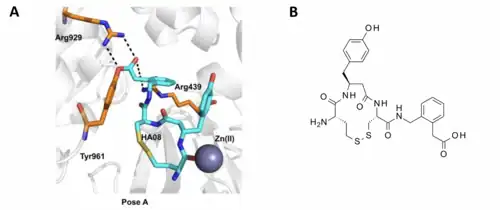 Figure 2. A. Crystal structure of IRAP co-crystallized with macrocycle HA08 in two binding poses. Adapted and recreated from PDB code 6YDX4. B. 2D chemical structure of HA08. The dotted lines depict the interaction of the ligand’s C-terminal with Arg 929.