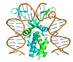 ![]() Crystallographic structure of the heterodimeric integration host factor (IHF) complex.[1] The alpha and beta subunits are colored cyan and green respectively while double stranded DNA is depicted as a brown cartoon. | |||||||