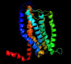 IL-8 receptors are 7-transmembrane proteins; they contain 7 alpha helices that each span the thickness of the phospholipid bilayer of a cell membrane. IL-8RA is a peptide of 350 amino acids, and IL-8RB is composed of 355 amino acids.[2] Receptors A and B share 78% of their sequence identity, and are considered to be the only two biologically significant receptors of IL-8.[5] The genes for both receptors are located on chromosome 2q35[5] and are each encoded by a single exon, and are 20 kb apart in distance. The close proximity and location of these two genes on the chromosome suggest that they are derived from the same ancestor sequence.[1] The reported size of the translated protein is approximately 40kD,[6] differing from the native purified receptors from the surface of neutrophils by 20kD. This difference could be due to the N-terminus glycosylations that occur post-translation and contribute to an increase in apparent size of the mature receptor.[6]