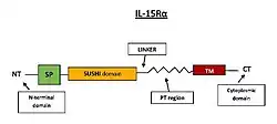 Nanrilkefusp alfa (RLI-15) is a fusion protein consisting of the NH2-terminal (amino acids 1–77, sushi+) cytokine-binding domain of IL-15Rα coupled to IL-15 via a 20-amino acid flexible linker. This fusion protein, referred to as protein receptor-linker-IL-15 (RLI-15) acts as an IL-15 superagonists specifically binding with high affinity the mid-affinity IL-2/IL-15 receptor formed by IL2RB and the Common gamma chainc or CD132), that has an increased serum half-life and biological activity similar to complexed IL-15/IL-15Rα-Fc. RLI-15 demonstrated a strong anti-tumor effect in two different tumor models.[49] RLI-15 is being produced and tested by Cytune Pharma affiliated company of SOTIO which renamed it to SO-C101, later to SOT101.[50] Phase 1 trial was initiated in 2019.[51]
