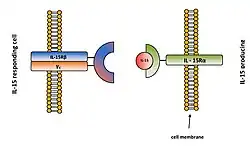 The prevailing mechanism of IL-15 action seems to be juxtacrine signaling or also determined as cell-to-cell contact. It also includes intracrine and reverse signaling. IL-15 was initially characterized as a soluble molecule. Later it was shown that IL-15 also exists as a membrane-bound form which represents the major form of IL-15 protein. In membrane-bound form it could be bound directly to cellular membrane or presented by IL-15Rα receptor.[13]