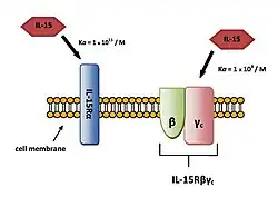 The main mechanism of IL-15 signaling is trans-presentation which is mediated by membrane-bound complex IL-15/IL-15Rα (Figure 3).[15] IL-15 bind to IL-15Rα receptor alone with an affinity of Ka = 1.1011/M. It can also bind to IL-15Rβγc signaling complex with lower affinity (Ka = 1.109/M) (Figure 4).[8]
