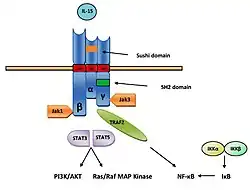 In mast cells, the IL-15R signaling pathway has been found to include Jak2 and STAT5 instead Jak1/3 and STAT3/5. Phosphorylation STATs form transcription factors and activate transcription of appropriate genes. The β chain of IL-15R recruits and also activates protein tyrosine kinases of the Src family including Lck, Fyn and Lyn kinase. It also activates phosphatidylinositol 3-kinase (PI3K) and AKT signaling pathway and induce expression of transcription factors including c-Fos, c-Jun, c-Myc and NF-κB.[13]