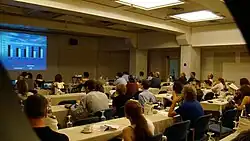 ![]() Members of the IMGS attending a session of the 24th International Mouse Genome Conference, held near Heraklion, Crete | |