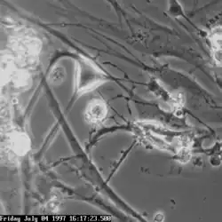 The picture to the right shows an isolated Interstitial cell of Cajal from the Myenteric plexus of the mouse small intestine grown in a primary cell culture. This cell type can be characterized morphologically as having a small cell body often triangular or stellate-shaped with several long processes branching out into secondary and tertiary extensions - these processes often contact smooth muscle cells. They have contractile behaviour in both the cell body and the extended processes.