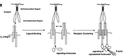 Invasin is a small membrane bound protein that enables the infiltration of cultured mammalian cells by enteric bacteria. The cellular entry of invasin is facilitated through the binding of multiple β1 chain integrins.[5] The interplay between invasin and β1 integrins initiates a reconfiguration of the cytoskeleton in the target cell, culminating in the creation of a groove and the internalization of bacteria through endosomes by the cell. Invasin is expressed inYersinia enterocolitica and Yersinia pseudotuberculosis because of its outermembrane being chromosomally encoded.[6] Invasin demonstrates a significantly enhanced binding affinity to β1 integrins compared to the natural ligands of the receptor. More precisely, it forms a robust attachment to the α5β1 integrin, typically employed by fibronectin, exhibiting roughly 100 times greater strength. This heightened binding capability arises from structural disparities between the two proteins. The extracellular region of invasin adopts a rod-like configuration, with dimensions measuring approximately 180 Å by 30 Å by 30 Å.[7]