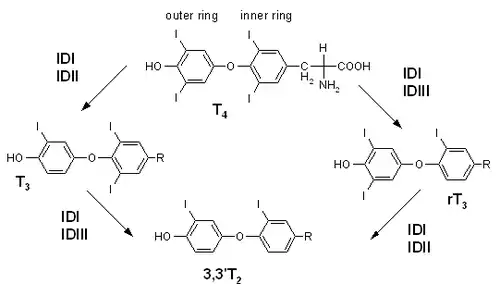 - ↑ Köhrle J (May 1999). "Local activation and inactivation of thyroid hormones: the deiodinase family". Molecular and Cellular Endocrinology. 151 (1–2): 103–19. doi:10.1016/S0303-7207(99)00040-4. PMID 10411325. S2CID 11333443.