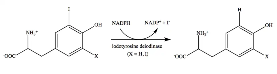- ↑ Goswami A, Rosenberg IN (December 1979). "Characterization of a flavoprotein iodotyrosine deiodinase from bovine thyroid. Flavin nucleotide binding and oxidation-reduction properties". The Journal of Biological Chemistry. 254 (24): 12326–30. doi:10.1016/S0021-9258(19)86319-6. PMID 500718.