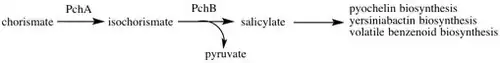 - ↑ Gaille C, Kast P, Haas D (June 2002). "Salicylate biosynthesis in Pseudomonas aeruginosa. Purification and characterization of PchB, a novel bifunctional enzyme displaying isochorismate pyruvate-lyase and chorismate mutase activities". The Journal of Biological Chemistry. 277 (24): 21768–75. doi:10.1074/jbc.M202410200. PMID 11937513. Retrieved April 2, 2015.