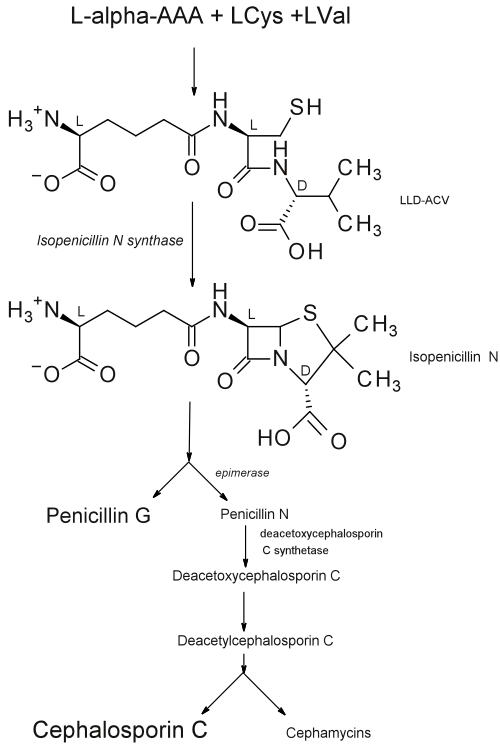 Following the IPNS pathway, further enzymes are responsible for the epimerization of isopenicillin N to penicillin N, the derivitazation to other penicillins, and the ring expansion that eventually leads to the various cephalosporins.[1]