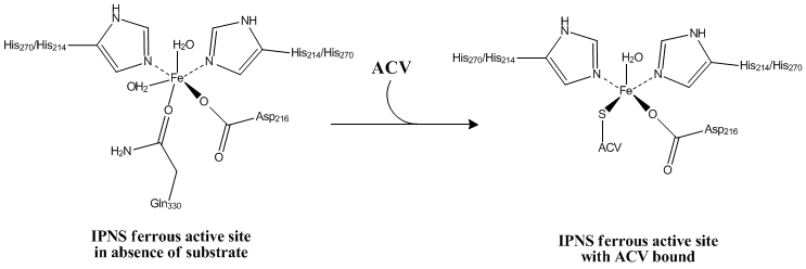A Fe(II) metal ion in the active site of the enzyme is coordinated by at least two histidine residues, an aspartate residue, a glutamine residue, and two water molecules in the absence of a bound substrate.[2] Just two histidine residues and one aspartic acid residue are entirely conserved. Therefore, it is highly significant that these two histidine residues, His214 and His270, and one aspartic acid residue, Asp216, are precisely the ones essential for activity.[3] When ACV binds the active site, Gln330 and one water molecule are replaced by the ACV thiolate.[2]