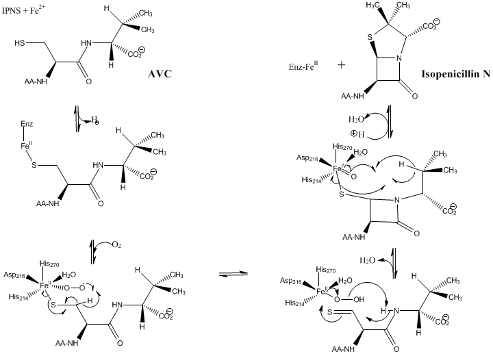 The ligation of ACV results in a decrease in the Fe(II)/Fe(III) redox potential, which facilitates the reduction of dioxygen to superoxide. Formation of a highly covalent RS-Fe(III) bond[5][6] lowers the activation barrier to dioxygen binding, thereby initiating the reaction cycle.[2] An intramolecular hydrogen atom transfer from C-3 of the cysteine residue (BDE= 93 kcal/mol) to the distal superoxo oxygen takes place, thereby converting the Fe(III) back to the Fe(II) oxidation state. A thioaldehyde and a hydroperoxy ligand (OOH) are produced in this process. The hydroperoxy ligand deprotonates the amide which then closes the β-lactam ring by a nucleophilic attack at the thioaldehyde carbon.[4]