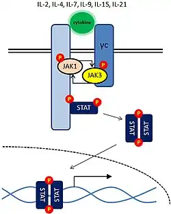 As JAK3 is expressed in hematopoietic and epithelial cells, its role in cytokine signaling is thought to be more restricted than other JAKs. It is most commonly expressed in T cells and NK cells,[7] but has also been found in intestinal epithelial cells.[10][11][12] JAK3 is involved in signal transduction by receptors that employ the common gamma chain (γc) of the type I cytokine receptor family (e.g. IL-2R, IL-4R, IL-7R, IL-9R, IL-15R, and IL-21R).[13] Mutations that abrogate Janus kinase 3 function cause an autosomal SCID (severe combined immunodeficiency disease),[14] while activating Janus kinase 3 mutations lead to the development of leukemia.[15]