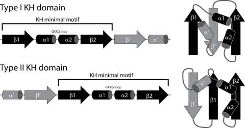 Structurally there are two different types of KH domains identified by Grishin which are called type I and type II.[4] The type I domains are mainly found in eukaryotic proteins, while the type II domains are predominantly found in prokaryotes. While both types share a minimal consensus sequence motif they have different structural folds. The type I KH domains have a three stranded beta-sheet where all three strands are anti-parallel. In the type II domain two of the three beta strands are in a parallel orientation. While type I domains are usually found in multiple copies within proteins, the type II are typically found in a single copy per protein.[5]