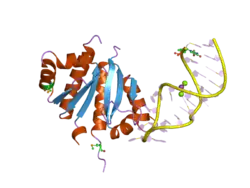 The K Homology (KH) domain is a protein domain that was first identified in the human heterogeneous nuclear ribonucleoprotein (hnRNP) K. An evolutionarily conserved sequence of around 70 amino acids, the KH domain is present in a wide variety of nucleic acid-binding proteins. The KH domain binds RNA, and can function in RNA recognition.[1] It is found in multiple copies in several proteins, where they can function cooperatively or independently. For example, in the AU-rich element RNA-binding protein KSRP, which has 4 KH domains, KH domains 3 and 4 behave as independent binding modules to interact with different regions of the AU-rich RNA targets.[1] The solution structure of the first KH domain of FMR1 and of the C-terminal KH domain of hnRNP K determined by nuclear magnetic resonance (NMR) revealed a beta-alpha-alpha-beta-beta-alpha structure.[2][3] Autoantibodies to NOVA1, a KH domain protein, cause paraneoplastic opsoclonus ataxia. The KH domain is found at the N-terminus of the ribosomal protein S3. This domain is unusual in that it has a different fold compared to the normal KH domain.[4]