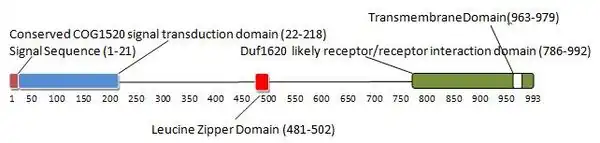 Analysis indicates the KIAA0090 unspliced protein product to be 993 amino acids long with an isoelectric point of 7.418 and a molecular weight of 111765.73 daltons.[6][7] The primary structure of this protein contains 4 conserved domains.[8] This includes a signal peptide from position 1 to 22, a COG1520 WD40 like domain, a leucine zipper domain, a DUF1620 domain (domain of unknown function), and a transmembrane domain. These can be viewed in Figure 2. Several conserved cysteine residues are present at positions 226,235, 335, 364,449, 581, 675, 925, and 985.[9] Several internal localization signals are also present.[10][11][12][13][14] Dependent on splice outcome and posttranslational modification, these additional signals indicate the protein could localize to the peroxisome, the plasma membrane, outside the cell, the cytosol, the nucleus, or mitochondria.