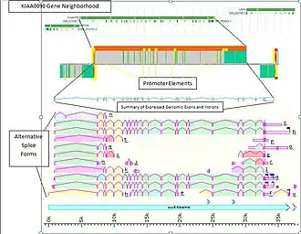 KIAA0090 is located on chromosome one in the p arm at location 1p36.132.[2] It covers 36.74 kb, from base pairs 19451486 to 19414744. The gene is composed of 37 gt-at introns/alternative introns with 57 exons expressed in 1 unspliced form of 4253 bp and 20 alternatively spliced forms of varying lengths.[3] The gene has 8 probable promoters.[4] The gene is flanked by UBR4 on its right and MRTO4 on its left.[1] This Information is graphically displayed in Figure 1.