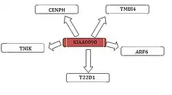 The WD40 like domain COG1520 is KIAA0090s only identified functional effector domain. WD40 containing proteins are signal transducers involved in transduction of signals to binding factors, the centromeres, and other effectors.[19] Coimmunoprecipitation experiments have proven KIAA0090 interaction with these types of proteins; specifically the centromeric protein CENPH, the BAX Inhibitor TMBI4, the ADP ribosylation factor ARF6, the kinase TNIK, and the transcriptional repressor T22D1.[20] The number of splice variants indicates this list is probably not definitive. As further characterization is completed additional interactions would be expected.