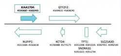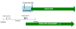 KIAA1704 is found on the chromosome 13, at locus q14.12, with the genomic sequence starting at 45,563,687 bp and ending at 45,602,405 bp.[10]