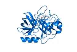 Kallikrein-related peptidase 7 (KLK7) is a serine protease that in humans is encoded by the KLK7 gene.[5][6][7][8] KLK7 was initially purified from the epidermis and characterised as stratum corneum chymotryptic enzyme (SCCE).[9] It was later identified as the seventh member of the human kallikrein family, which includes fifteen homologous serine proteases located on chromosome 19 (19q13).[10]