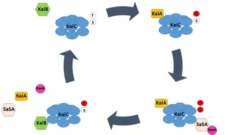 - ↑ Nakajima M, Ito H, Kondo T (March 2010). "In vitro regulation of circadian phosphorylation rhythm of cyanobacterial clock protein KaiC by KaiA and KaiB". FEBS Letters. 584 (5): 898–902. doi:10.1016/j.febslet.2010.01.016. PMID 20079736.