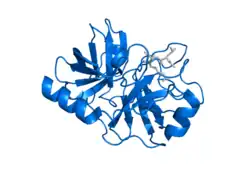 Kallikrein-5, formerly known as stratum corneum tryptic enzyme (SCTE), is a serine protease expressed in the epidermis. In humans it is encoded by the KLK5 gene.[5][6][7][8][9][10] This gene is one of the fifteen kallikrein subfamily members located in a cluster on chromosome 19. Its expression is up-regulated by estrogens and progestins. Alternative splicing results in multiple transcript variants encoding the same protein.[10]