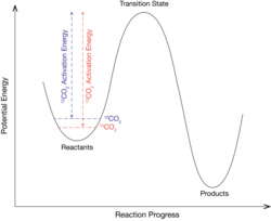 The isotopic substitutions that can occur in this reaction are for carbon, oxygen, and/or hydrogen, though currently only a significant isotope effect is seen for carbon isotope substitution.[11] Isotopes are atoms that have the same number of protons but varying numbers of neutrons. "Lighter" isotopes (like the stable carbon-12 isotope) have a smaller overall mass, and "heavier" isotopes (like the stable carbon-13 isotope or radioactive carbon-14 isotope) have a larger overall mass. Stable isotope geochemistry is concerned with how varying chemical and physical processes preferentially enrich or deplete stable isotopes. Enzymes like RuBisCO cause isotopic fractionation because molecules containing lighter isotopes have higher zero-point energies (ZPE), the lowest possible quantum energy state for a given molecular arrangement.[12] For this reaction, 13CO2 has a lower ZPE than 12CO2 and sits lower in the potential energy well of the reactants. When enzymes catalyze chemical reactions, the lighter isotope is preferentially selected because it has a lower activation energy and is thus more energetically favorable to overcome the high potential-energy transition state and proceed through the reaction. Here, 12CO2 has a lower activation energy so more 12CO2 than 13CO2 goes through the reaction, resulting in the product (3 PGA) being lighter.