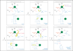 The fixation of CO2 by RuBisCO is a multi-step process. First, a CO2 molecule (that is not the CO2 molecule that is eventually fixed) attaches to the uncharged ε-amino group of lysine 201 in the active site to form a carbamate.[7] This carbamate then binds to the magnesium ion (Mg2+) in RuBisCO's active site. A molecule of RuBP then binds to the Mg2+ ion. The bound RuBP then loses a proton to form a reactive, enodiolate species.[7] The rate-limiting step of the Calvin-Benson cycle is the addition of CO2 to this 2,3-enediol form of RuBP.[8][9][10] This is the stage where the intrinsic KIE of Rubisco occurs because a new C-C bond is formed. The newly formed 2-carboxy-3-keto-D-arabinitol 1,5-bisphosphate molecule is then hydrated and cleaved to form two molecules of 3-phosphoglycerate (3 PGA). 3 PGA is then converted into hexoses to be used in the photosynthetic organism's central metabolism.[7]
