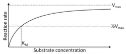The rate of carboxylation (VC) is the rate that RuBisCO fixes CO2 to RuBP under substrate saturated conditions.[14] A higher value of VC corresponds to a higher rate of carboxylation. This rate of carboxylation can also be represented through its Michaelis-Menten constant KC, with a higher value of KC corresponding to a higher rate of carboxylation. VC is represented by Vmax, and KC is represented as KM in the generalized Michaelis-Menten curve. Although the rate of carboxylation varies among RuBisCO types, RuBisCO on average fixes only three molecules of CO2 per second.[17] This is remarkably slow compared to typical enzyme catalytic rates, which usually catalyze reactions at the rate of thousands of molecules per second.[17]