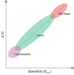 Sc/o has been positively correlated with the magnitude of carbon isotope fractionation (represented by Δ13C), with larger values of Sc/o corresponding with a larger values of Δ13C.[11] It has been theorized that because increasing Sc/o means the transition state is more like the product, the O2C---C-2 bond will be shorter, resulting in a higher overall potential energy & vibrational energy.[11] This creates a higher energy transition state, which makes it even harder for 13CO2 (lower in the potential energy well than 12CO2) to overcome the required activation energy.[11] The RuBisCOs used by varying photosynthetic organisms vary slightly in their enzyme structure, and this enzyme structure results in varying transition states. This diversity in enzyme structure is reflected in the resulting Δ13C values measured from different photosynthetic organisms. However, overlap exists between the Δ13C values of different groups because the carbon isotope values measured are generally of the entire organism, and not just its RuBisCO enzyme. Many other factors, including growth rate and the isotopic composition of the starting substrate, can affect the carbon isotope values of whole organism and cause the spread seen in C isotope measurements.[20][21]