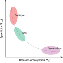 It has been observed among natural RuBisCOs that an increased ability to distinguish between CO2 and O2 (larger values of Sc/o) corresponds with a decreased rate of carboxylation (lower values of VC and KC).[18] The variation and trade-off between Sc/o and KC has been observed across all photosynthetic organisms, from photosynthetic bacteria and algae to higher plants.[18] Organisms using RuBisCOs with high values of VC / KC, and low values of Sc/o have localized RuBisCO to areas within the cell with artificially high local CO2 concentrations. In cyanobacteria, concentrations of CO2 are increased using a carboxysome, an icosahedral protein compartment about 100 nm in diameter that selectively uptakes bicarbonate and converts it to CO2 in the presence of RuBisCO.[19] Organisms without a CCM, like certain plants, instead utilize RuBisCOs with high values of Sc/o and low values of VC and KC.[18] It has been theorized that groups with a CCM have been able to maximize KC at the expense of decreasing Sc/o, because artificially enhancing the concentration of CO2 would decrease the concentration of O2 and remove the need for high CO2 specificity. However, the opposite is true for organisms without a CCM, who must optimize Sc/o at the expense of KC because O2 is readily present in the atmosphere.
