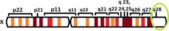 The human L1CAM gene is found in X chromosome regions that are implicated in different neuromuscular diseases, and near the one associated with mental retardation. The L1CAM gene is located in the long arm of X chromosome in Xq28 position.[10][11]