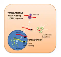 Because L1CAM is considered to be a key factor in metastasis, it has been suggested that blocking this protein may inhibit cancer cells migration and tumor progression. Antibody therapy directed against L1CAM in mice models of cancer block tumor growth but enhance EMT.[38] Liposome-encapsulated small interfering RNA has also proved to be an effective inhibitor for L1CAM expression as its function is to degrade a specific range of mRNA base pairs (in this case, the ones encoding for L1CAM sequence of amino acids) after transcription, so that the protein cannot be synthetised. Nevertheless, these possible therapies involving L1CAM as a target in human cancer are still in preclinical research.[39]