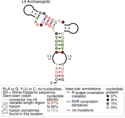 An L4 ribosomal protein leader is a ribosomal protein leader involved in ribosome biogenesis. It is used as an autoregulatory mechanism to control the concentration of the ribosomal protein L4. Known Examples were predicted in Archaeoglobi with bioinformatic approaches.[1] The structure is located in the 5′ untranslated regions of mRNAs encoding ribosomal proteins L3 (rplC), L4 (rplD), L23 (rplW) and L2 (rplB).[1]