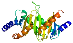 - ↑ Lunin VV, Munger C, Wagner J, Ye Z, Cygler M, Sacher M (May 2004). "The structure of the MAPK scaffold, MP1, bound to its partner, p14. A complex with a critical role in endosomal map kinase signaling". J. Biol. Chem. 279 (22): 23422–30. doi:10.1074/jbc.M401648200. PMID 15016825.