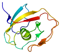 In molecular biology, the LCCL domain is a protein domain which has been named after several well-characterised proteins that were found to contain it, namely Limulus clotting factor C, Cochlin (Coch-5b2) and Lgl1 (CRISPLD2). It is an about 100 amino acids domain whose C-terminal part contains a highly conserved histidine in a conserved motif YxxxSxxCxAAVHxGVI. The LCCL module is thought to be an autonomously folding domain that has been used for the construction of various modular proteins through exon-shuffling. It has been found in various metazoan proteins in association with complement B-type domains, C-type lectin domains, von Willebrand type A domains, CUB domains, discoidin lectin domains or CAP domains. It has been proposed that the LCCL domain could be involved in lipopolysaccharide (LPS) binding.[1][2] LCCL exhibits a novel fold.[3]