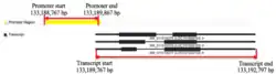 There is one promoter for the LOC101928193 gene (GXP_6058323), and it is 1101 nucleotides long on the positive strand from base pairs 133,188,767 to 133,189,867 on chromosome 9.[21] The transcription start site can be found at the 1001 base pair position.[21]