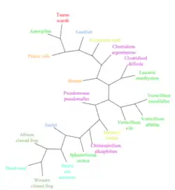 - ↑ Hinchliff CE, Smith SA, Allman JF, Burleigh JG, Chaudhary R, Coghill LM, Crandall KA, Deng J, Drew BT, Gazis R, Gude K, Hibbett DS, Katz LA, Laughinghouse HD, McTavish EJ, Midford PE, Owen CL, Ree RH, Rees JA, Soltis DE, Williams T, Cranston KA (October 2015). "Synthesis of phylogeny and taxonomy into a comprehensive tree of life". Proceedings of the National Academy of Sciences of the United States of America. 112 (41). TimeTree: 12764–9. Bibcode:2015PNAS..11212764H. doi:10.1073/pnas.1423041112. PMC 4611642. PMID 26385966.