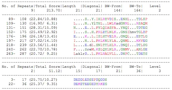 LRRC23 spans 343 residues containing two varieties of internally repeating sequence. Detected and aligned by RADAR,[9] the most abundant repeat is the leucine-rich repeat, repeating 9 times in bases 89-287. The other repeated sequence occurs twice in bases 3-36. The RADAR program output, below, summarizes the composition and location of all the repeats and aligns them for comparison against each other.