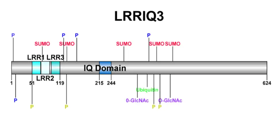 LRRIQ3 is predicted to undergo many post-translational modifications. These include O-GlcNAcylation, SUMOylation, ubiquitination, and phosphorylation.[22][23] LRRIQ3 is predicted to have 4 well conserved SUMOylation sites and 1 well conserved ubiquitination site.[22] A representation of these post-translational modifications is shown in the figure below.