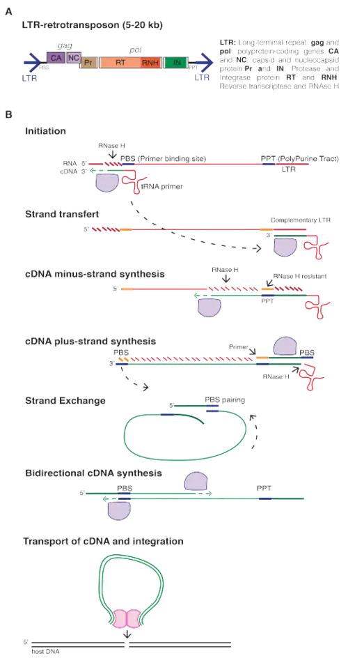 Reverse transcription usually initiates at a short sequence located immediately downstream of the 5'-LTR and termed the primer binding site (PBS). Specific host tRNAs bind to the PBS and act as primers for reverse-transcription, which occurs in a complex and multi-step process, ultimately producing a double- stranded cDNA molecule. The cDNA is finally integrated into a new location, creating short TSDs (Target Site Duplications) [10] and adding a new copy in the host genome