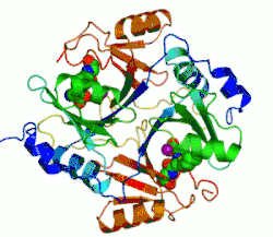 ![]() Ribbon diagram of human glyoxalase I with its catalytic zinc ions shown as two purple spheres. An inhibitor, S-hexylglutathione, is shown as a space-filling model; the green, red, blue and yellow spheres correspond to carbon, oxygen, nitrogen and sulfur atoms, respectively. | |||||||||