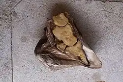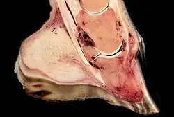 The bones of the hoof are suspended within the axial hooves of ungulates by layers of modified skin cells, known as laminae or lamellae, which act as shock absorbers during locomotion. In horses, there are about 550–600 pairs of primary epidermal laminae, each with 150–200 secondary laminae projecting from their surface.[1] These interdigitate with equivalent structures on the surface of the coffin bone (PIII, P3, the third phalanx, pedal bone, or distal phalanx), known as dermal laminae.[2] The secondary laminae contain basal cells which attach via hemidesmosomes to the basement membrane. The basement membrane is then attached to the coffin bone via the connective tissue of the dermis.[1]