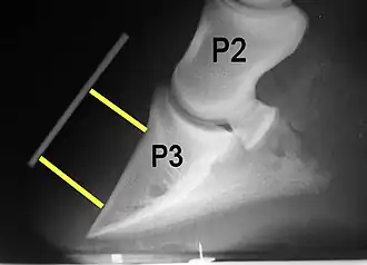 - Horn:lamellar distance (HL): the measurement from the most superficial aspect of the dorsal hoof wall to the face of P3. 2 distances are compared: a proximal measurement made just distal to the extensor process of P3, and a distal measurement made toward the tip of P3. These two values should be similar. In cases of rotation, the distal measurement will be higher than the proximal. In cases of distal displacement, both values will increase, but may remain equal. Therefore, it is ideal to have baseline radiographs for horses, especially for those at high-risk for laminitis, to compare to should laminitis ever be suspected. Normal HL values vary by breed and age:[1]
